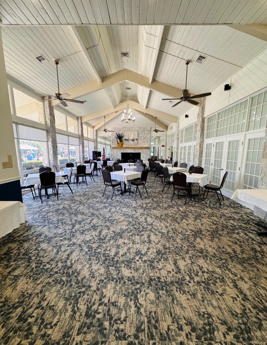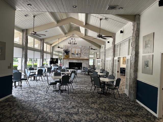 Our Grille Room, the original dining room of Sugarmill Woods features a beautiful stone fireplace, vintage chandelier with a wood beamed ceiling.